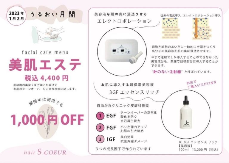 1月2月でうるおい月間をしております。 冬はとても乾燥する季節になっておりますので、髪だけではなく、お顔もエスクールに来て潤いを与えてはみませんか?