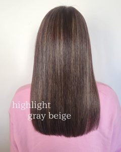 細めのハイライトたっぷりの艶髪カラー🌿 落ち着いたベージュでさらに大人っぽく✨