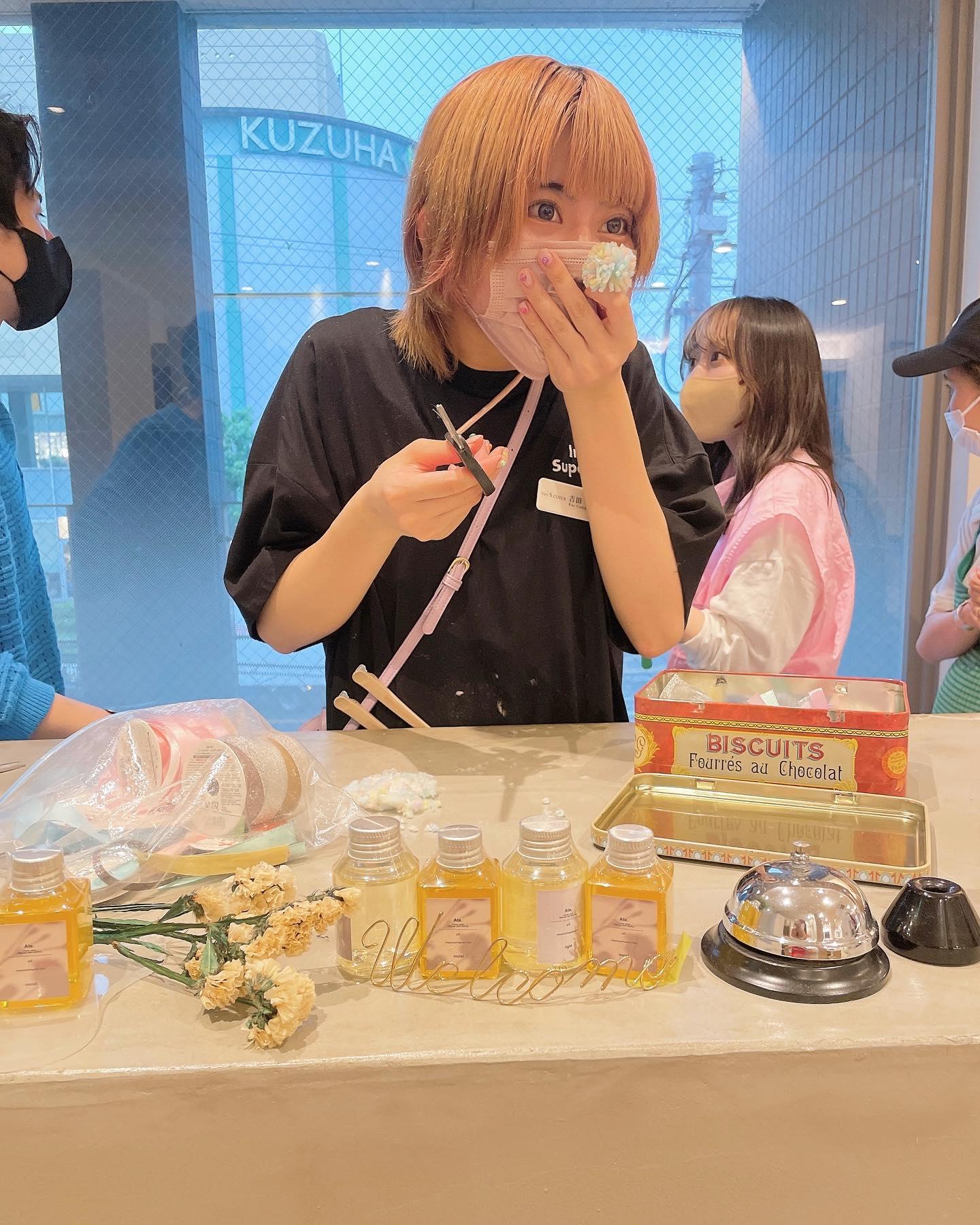子供のカット終わりのヘアアレンジの時に選んで頂くヘアゴム作り❤️🧡の最中に雷⚡️がなって怖がってる瞬間のよっしゃらと、なってるねーー雨すごいねーーって外を眺めてる先輩と同期😊